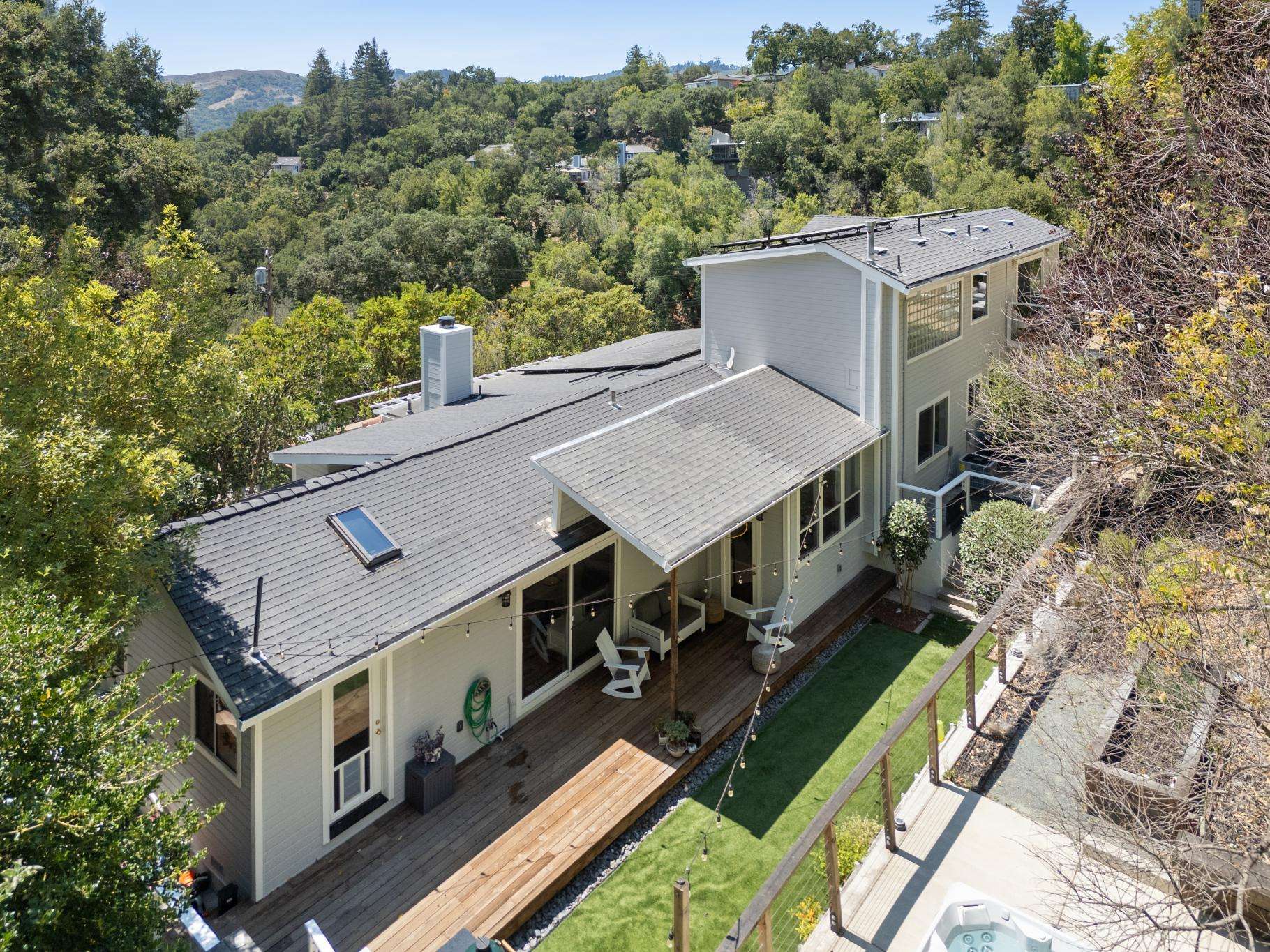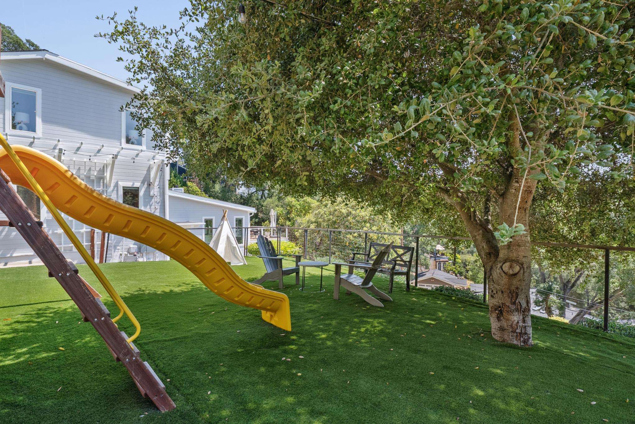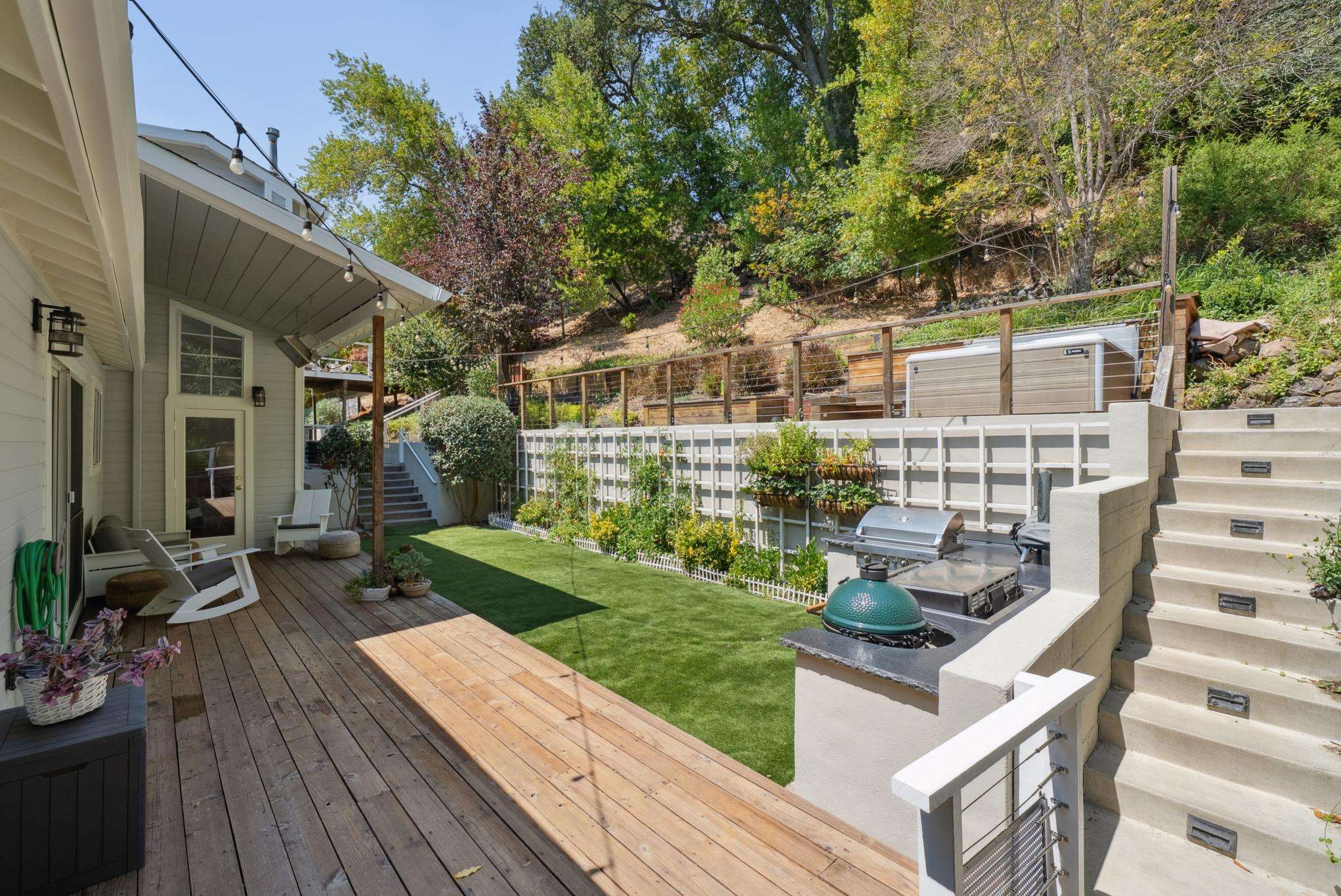 The main living room exudes warmth with its handsome stone fireplace and hardwood floors running throughout, while a den offers a built-in desk carved from natural wood — ideal for work, study, or creative pursuits. Indoor-outdoor living is effortless here. Expansive decks overlook the beautifully landscaped grounds on a .69-acre lot, offering areas for dining, lounging, and play. The built-in outdoor kitchen, new hot tub level with garden bed, and multiple level lawn areas — including synthetic turf for year-round greenery — set the stage for unforgettable entertaining. Vegetable trellises and mature plantings create an ever-changing seasonal backdrop, while a play structure and moveable fire pit add both charm and functionality. Enjoy the tranquility of the vegetable garden and fire pit, and unwind on the inviting porch that embraces natural surroundings.