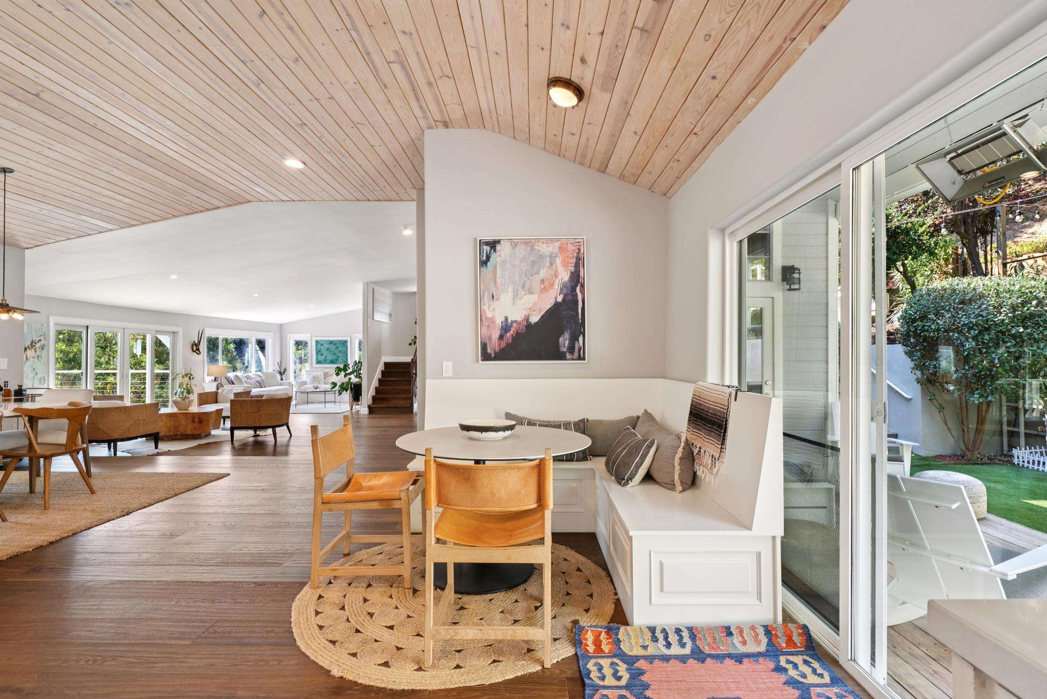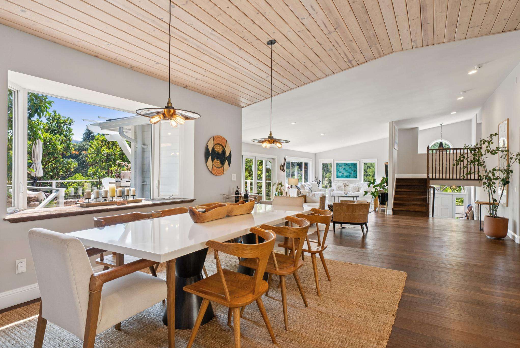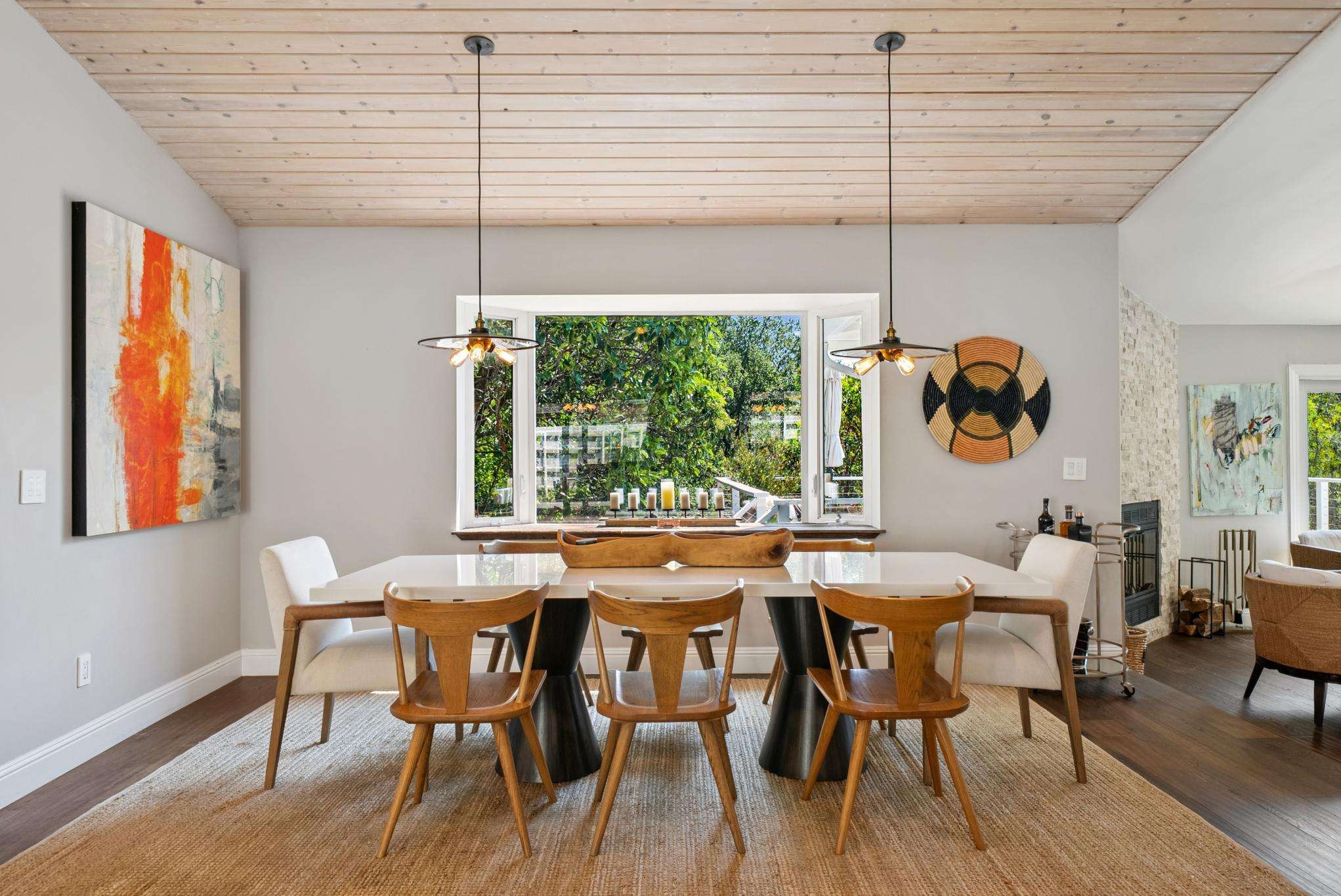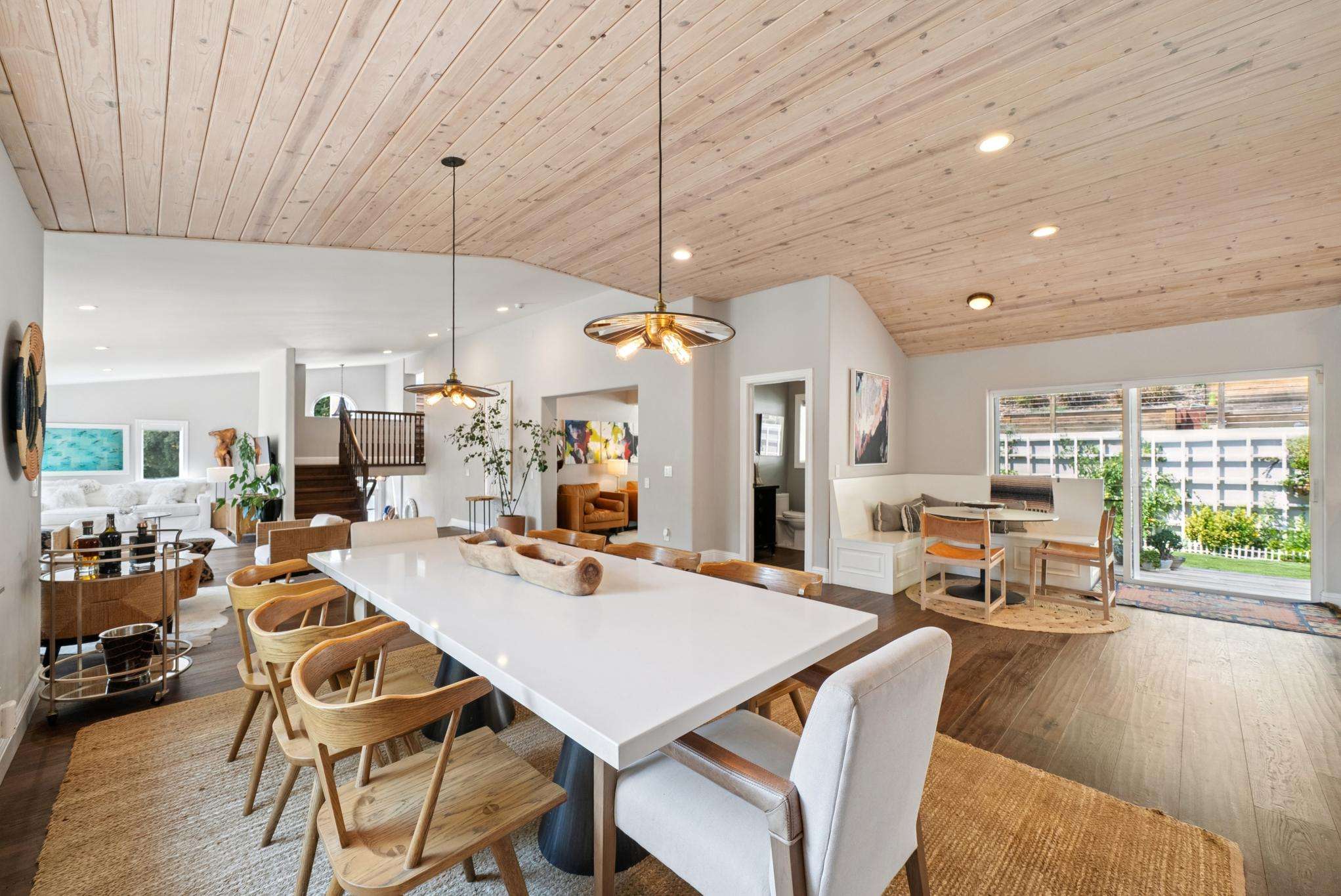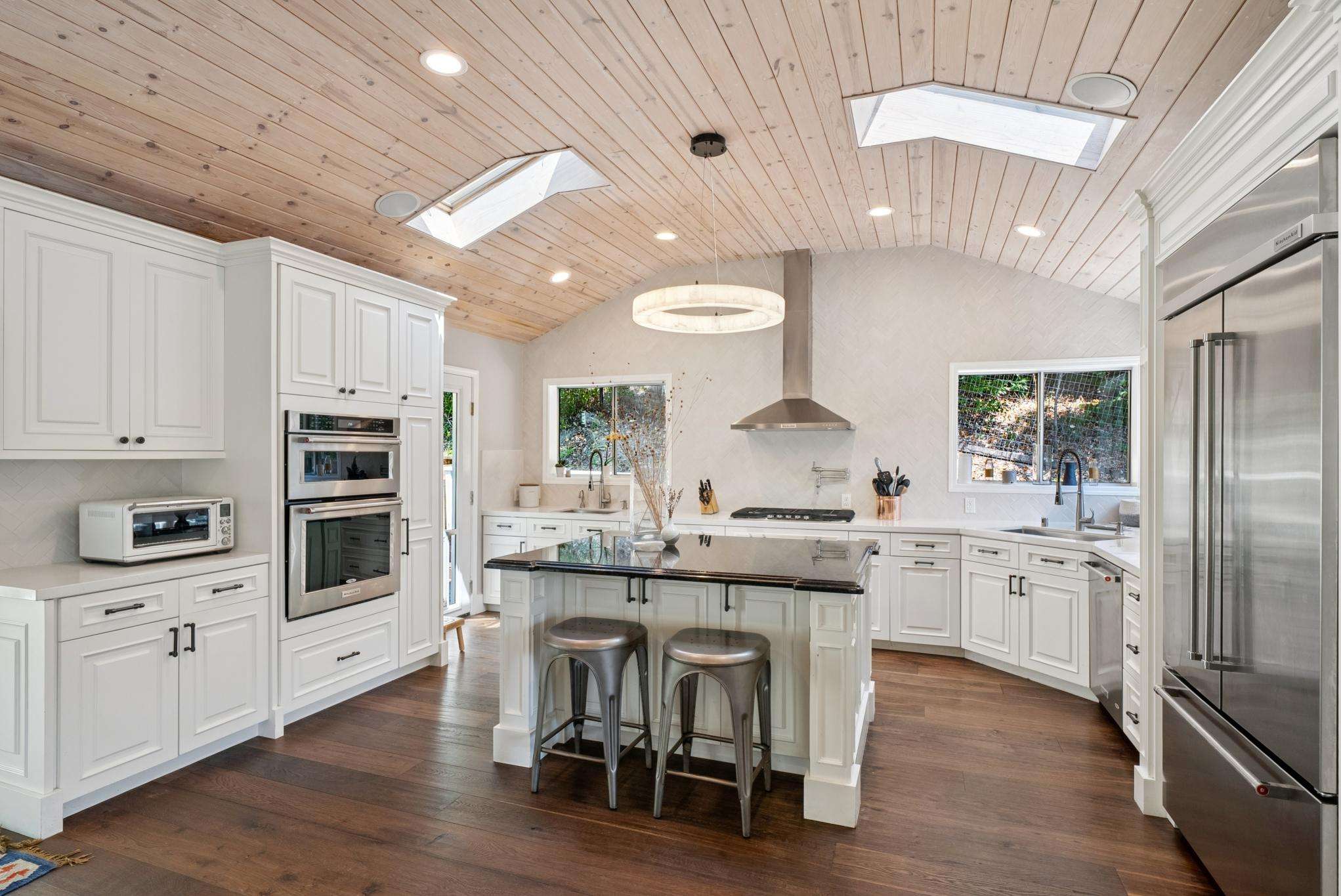 This exceptional residence offers four spacious bedrooms, three-and-a-half beautifully updated bathrooms, a dedicated home office with private entrance, and a generous den with beautiful live-edge built-ins — all across 4190 square feet of light-filled, modernized living space. From the moment you arrive, the freshly painted exterior, eye-catching lattice work, and lush landscaping set a tone of elegance. Step through the formal entry, and you’re greeted by soaring ceilings, skylights, and large windows that bathe the home in natural light. The airy, open layout invites you toward the showpiece of the home — the remodeled kitchen. Here, a striking wood barrel ceiling crowns the space, complementing the brand-new counter-to-ceiling herringbone backsplash crafted from Italian handmade ceramic tile. High-end stainless steel appliances, dual sinks, new lighting, and an eat-in island create a chef’s dream and the heart of the home — equally perfect for lively gatherings or quiet mornings. A breakfast nook with garden views, a dining area with a Bay window, and seamless flow to multiple living spaces make this kitchen the true hub of daily life.