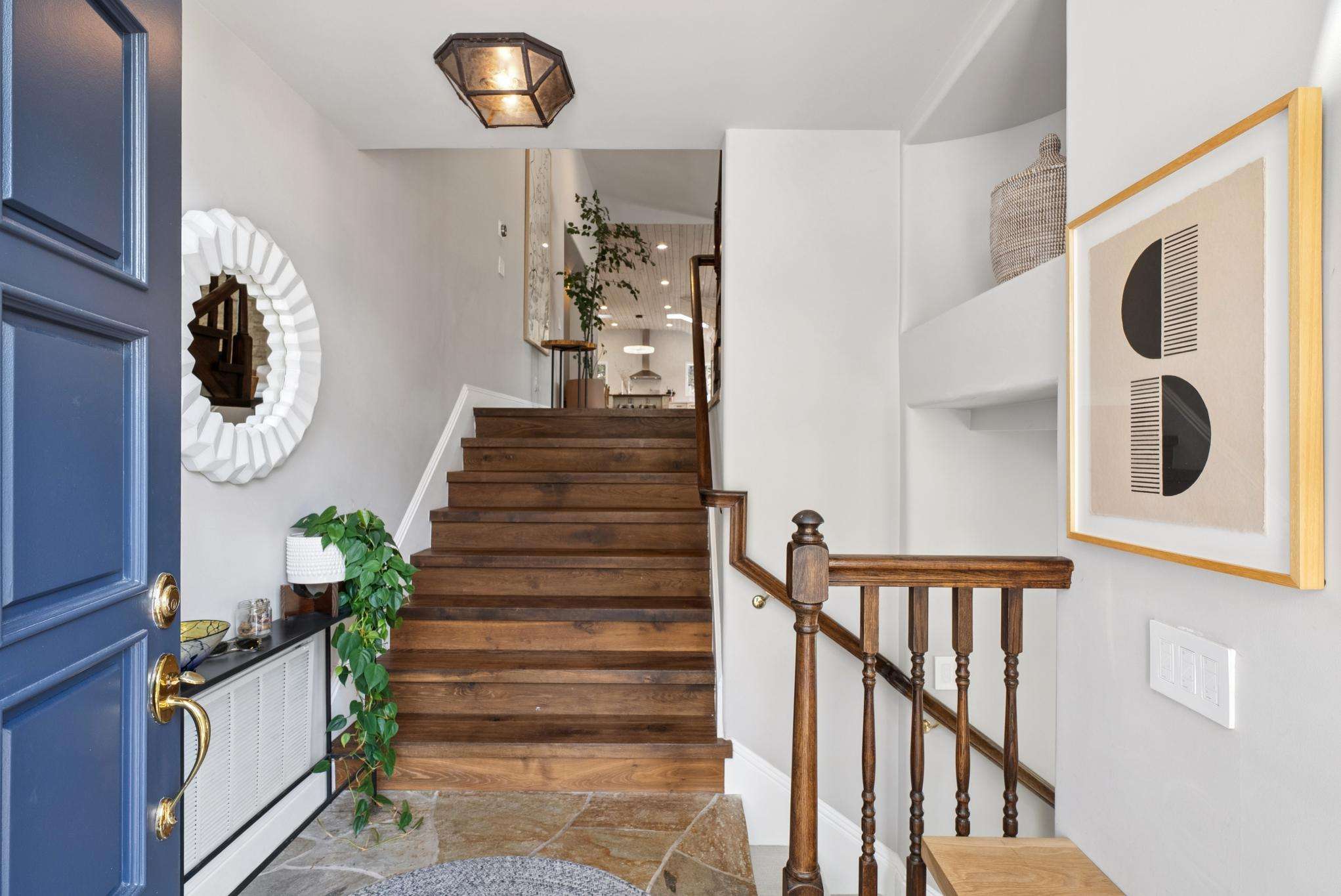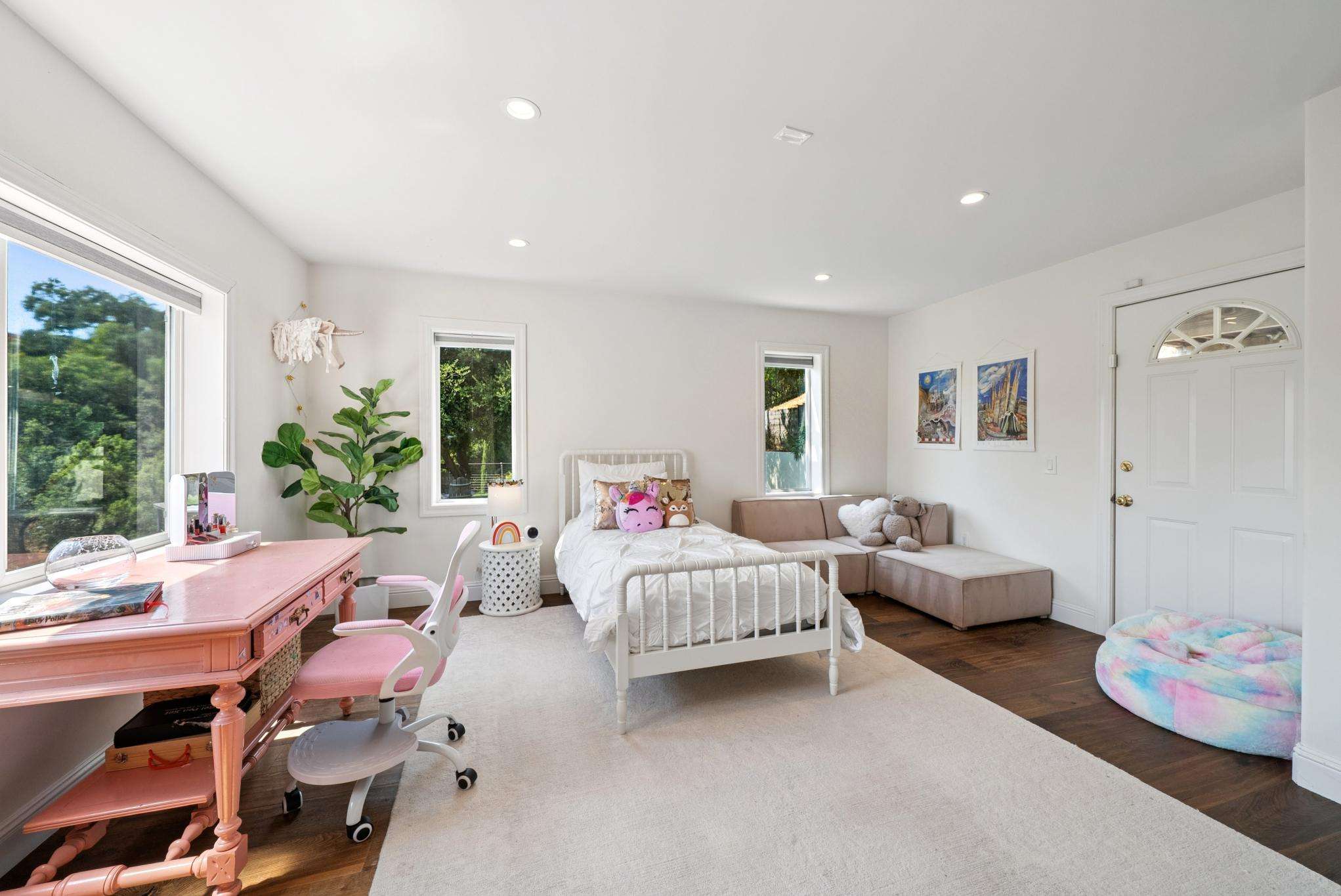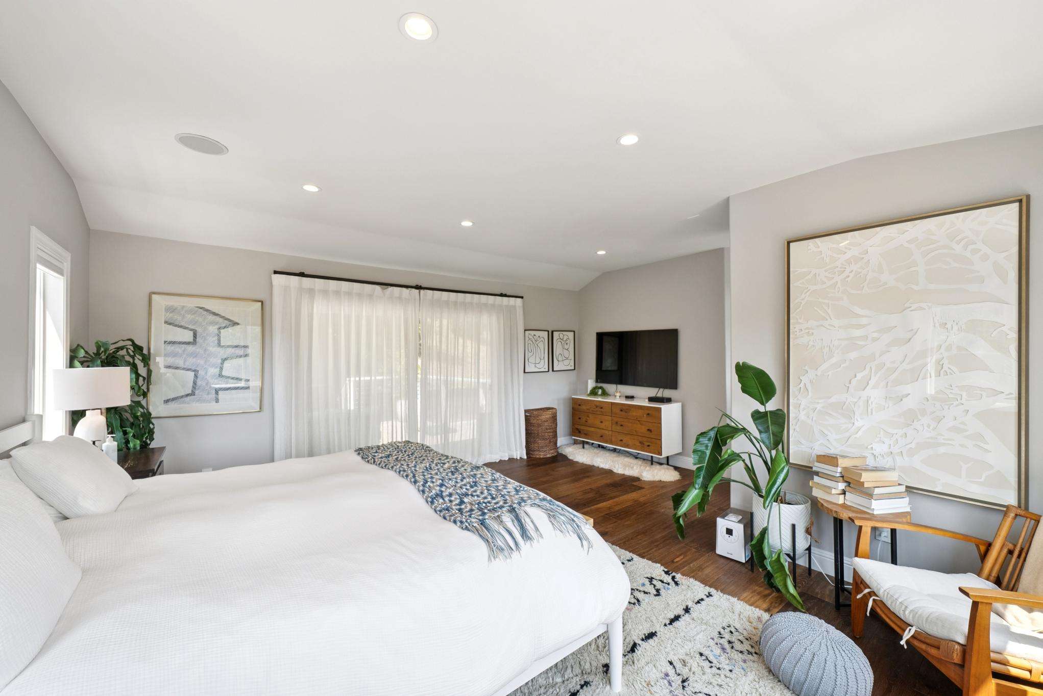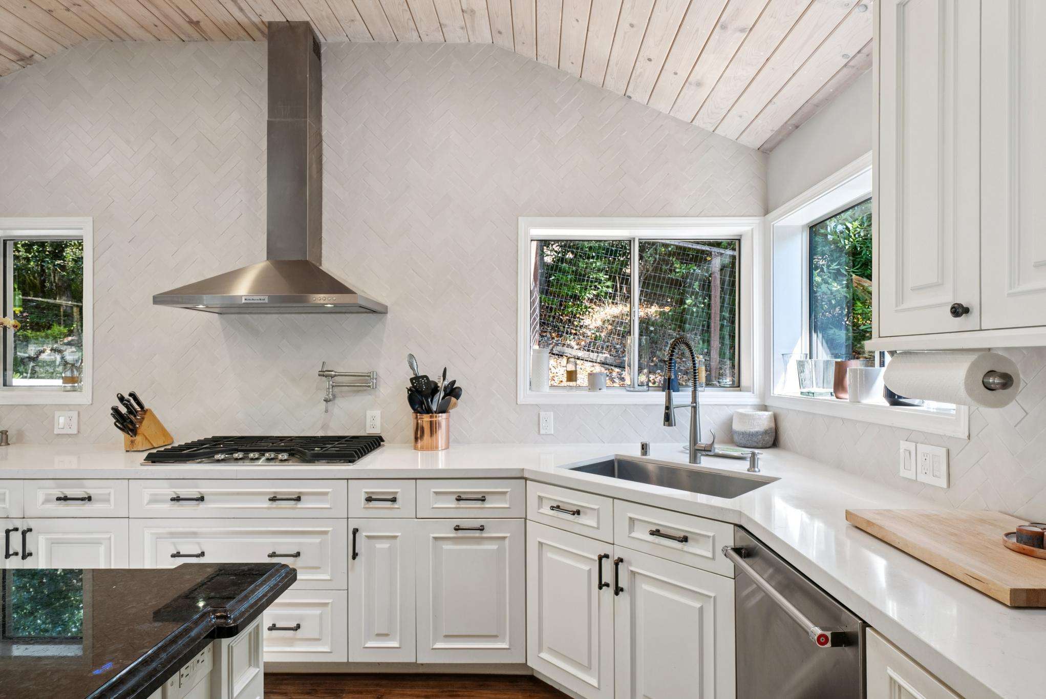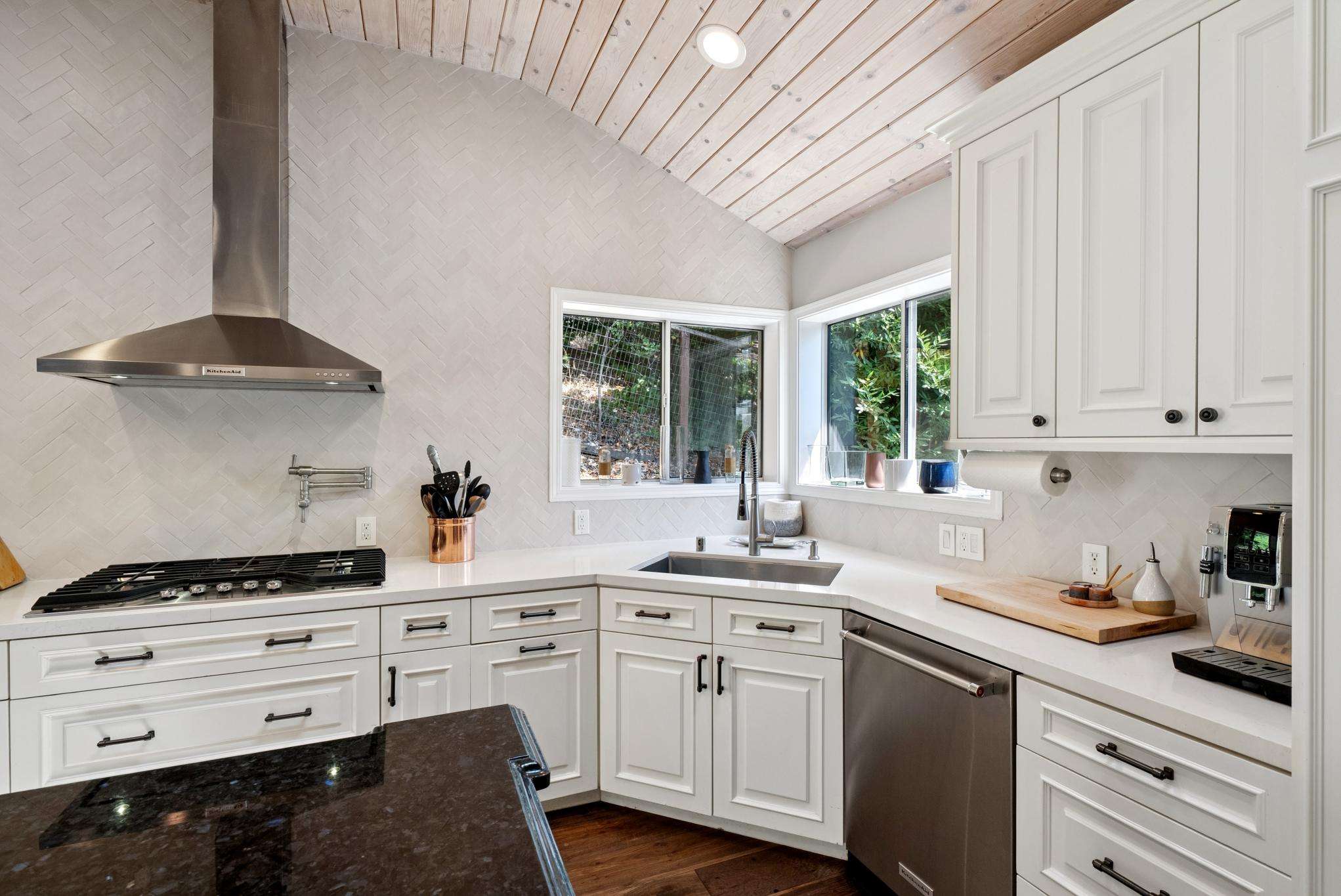 This exceptional residence offers four spacious bedrooms, three-and-a-half beautifully updated bathrooms, a dedicated home office with private entrance, and a generous den with beautiful live-edge built-ins — all across 4190 square feet of light-filled, modernized living space. From the moment you arrive, the freshly painted exterior, eye-catching lattice work, and lush landscaping set a tone of elegance. Step through the formal entry, and you’re greeted by soaring ceilings, skylights, and large windows that bathe the home in natural light. The airy, open layout invites you toward the showpiece of the home — the remodeled kitchen. Here, a striking wood barrel ceiling crowns the space, complementing the brand-new counter-to-ceiling herringbone backsplash crafted from Italian handmade ceramic tile. High-end stainless steel appliances, dual sinks, new lighting, and an eat-in island create a chef’s dream and the heart of the home — equally perfect for lively gatherings or quiet mornings. A breakfast nook with garden views, a dining area with a Bay window, and seamless flow to multiple living spaces make this kitchen the true hub of daily life.